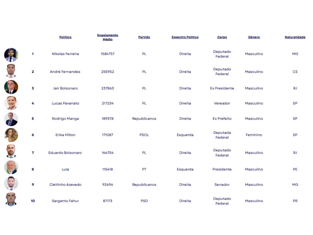 No Top 10, figuram: 1 Nikolas Ferreira, 2 André Fernandes, 3 Jair Bolsonaro, 4 Lucas Pavanato, 5 Rodrigo Manga, 6 Erika Hilton, 7 Eduardo Bolsonaro, 8 Lula, 9 Cleitinho Azevedo, 10 Sargento Fahur.