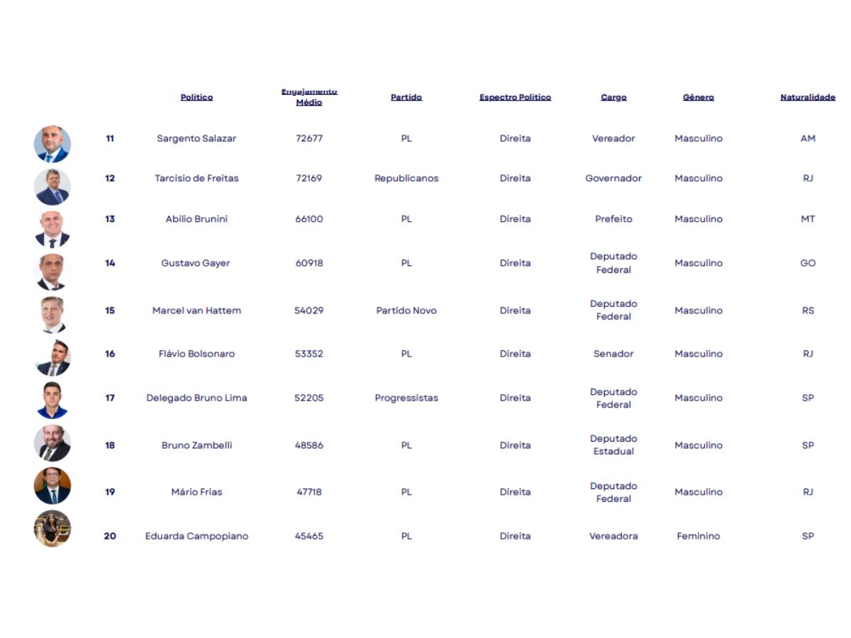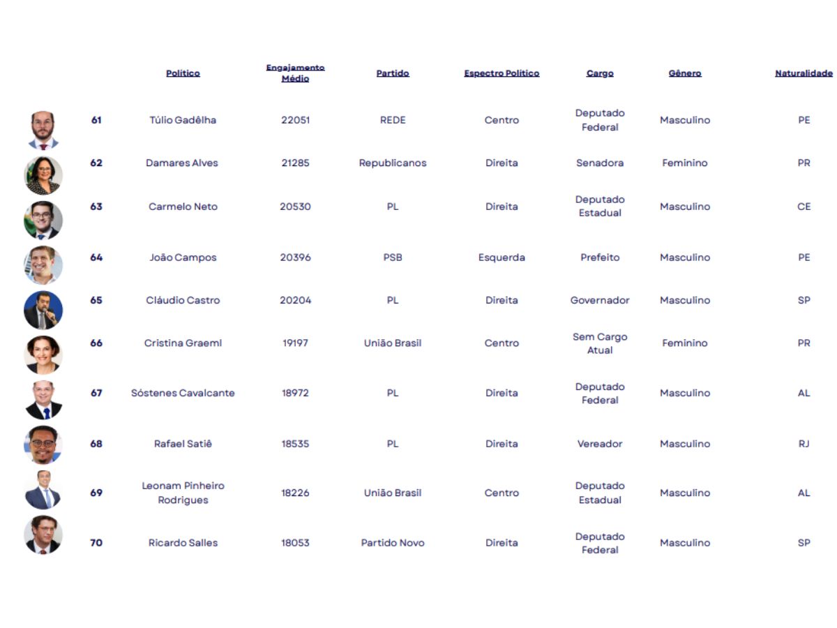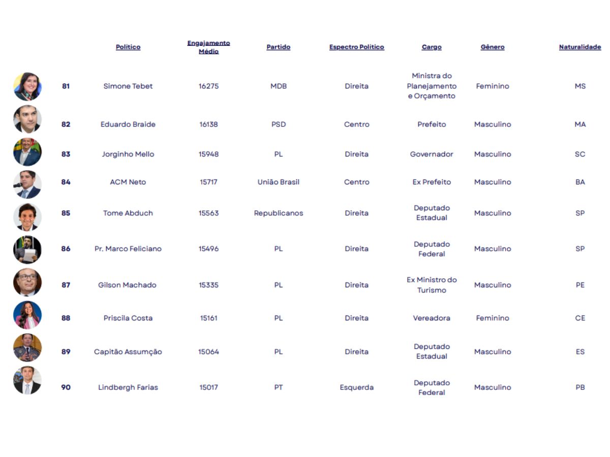 O estudo apontou ainda que a hegemonia está no poder legislativo, com deputados federais e estaduais na dianteira, seguidos por vereadores e senadores. O engajamento elevado, porém, não depende de mandatos ativos, já que políticos fora do exercício também figuram entre os mais influentes.