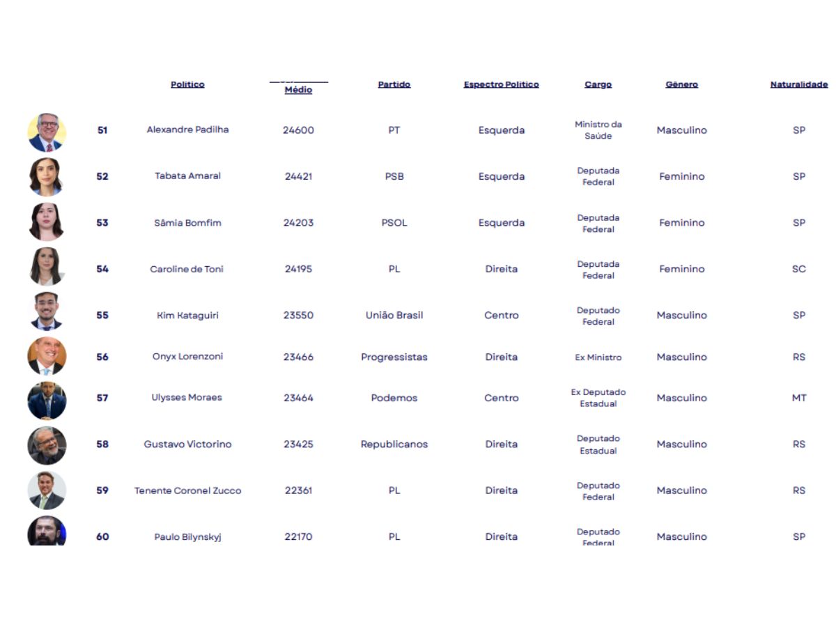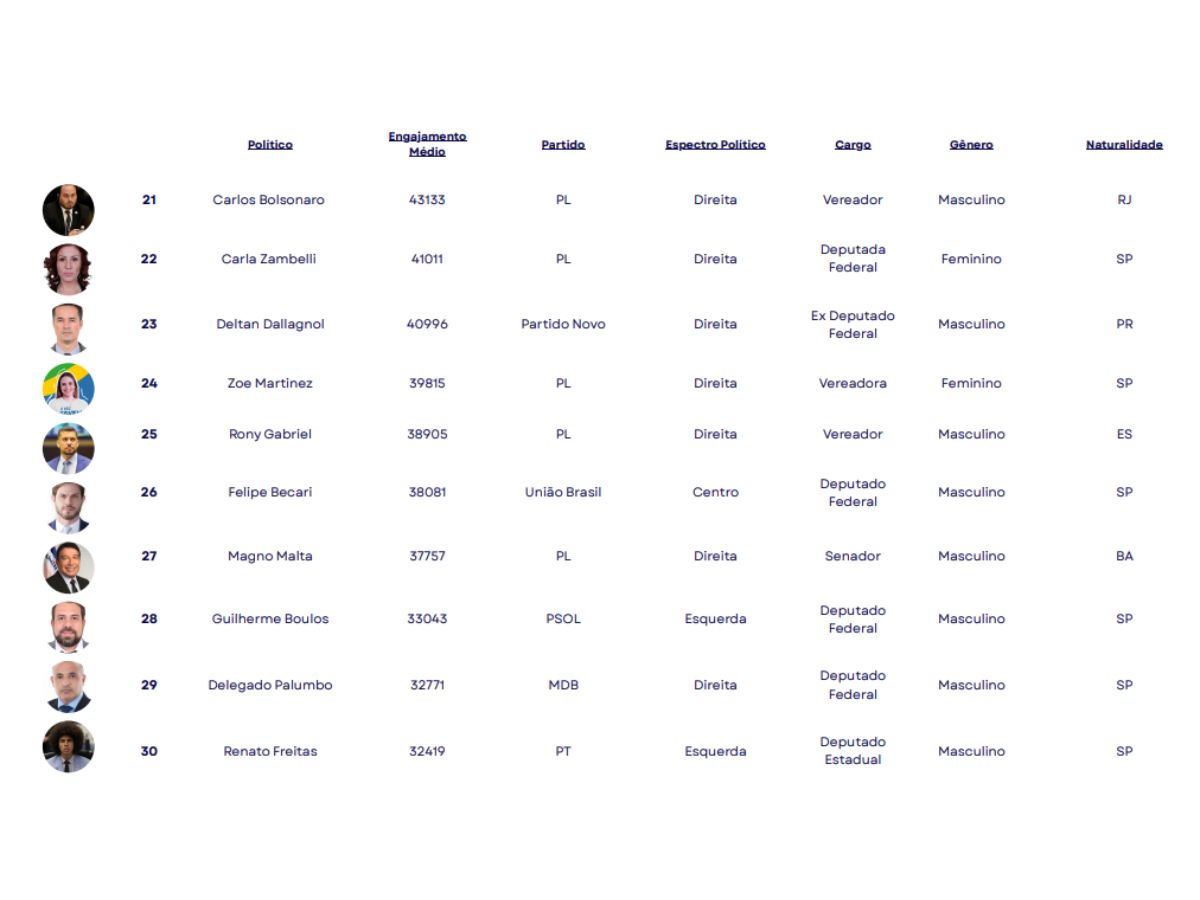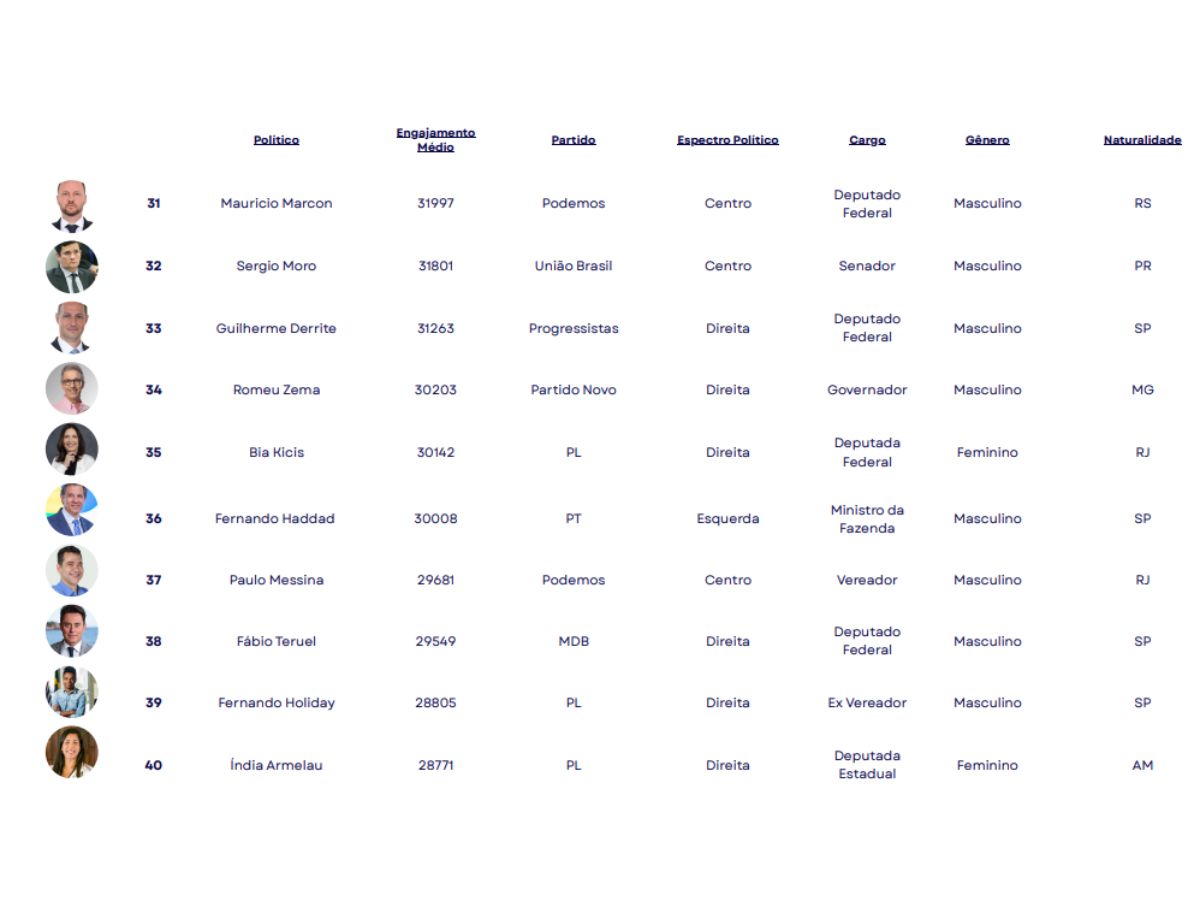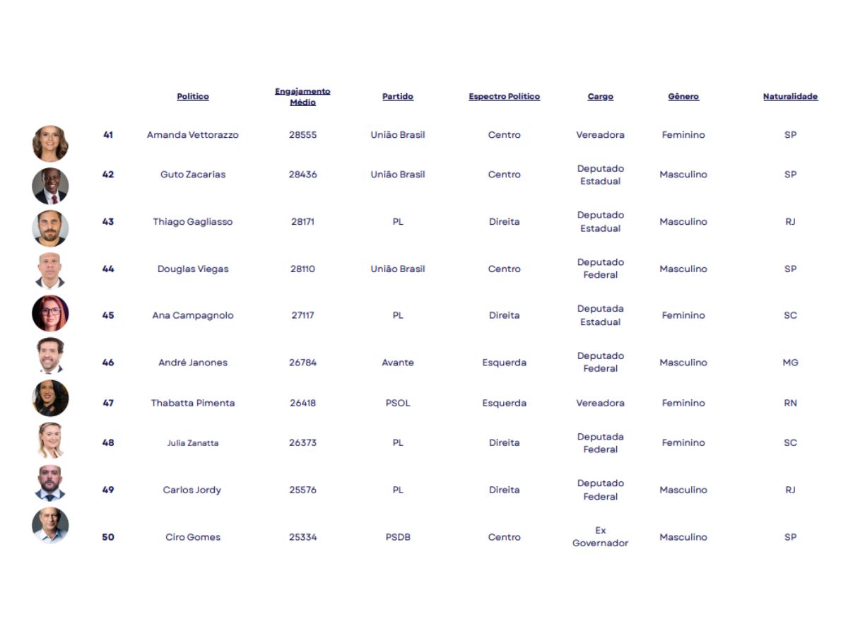 O estudo apontou ainda que a hegemonia está no poder legislativo, com deputados federais e estaduais na dianteira, seguidos por vereadores e senadores. O engajamento elevado, porém, não depende de mandatos ativos, já que políticos fora do exercício também figuram entre os mais influentes.